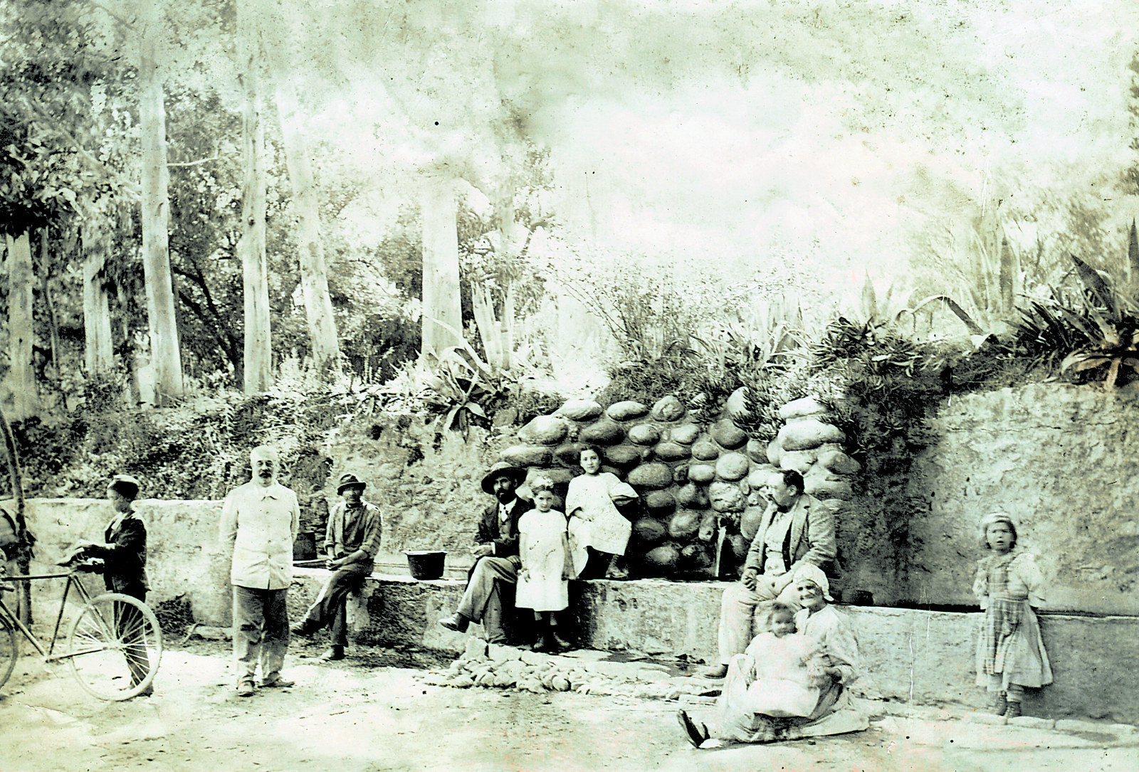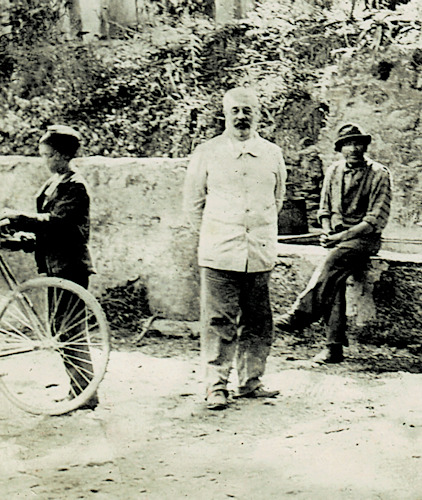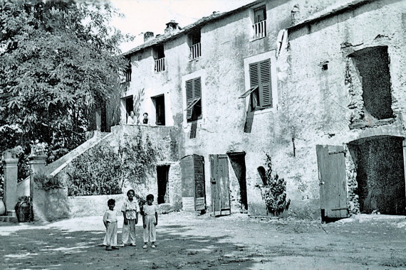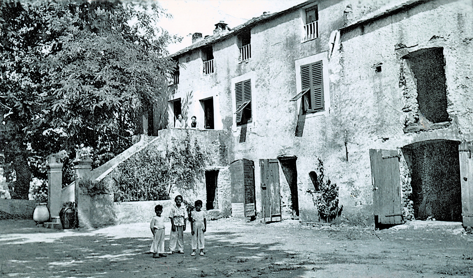 Photo prise en 1938 devant la bâtisse : au pied du mur de la maison, on voit poindre la jeune bougainvillée, qui agrémente à présent toute la façade du bâtiment.