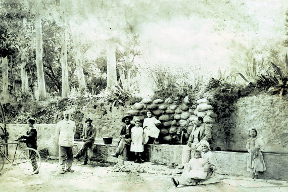 Photo prise en 1914 devant le bâtiment principal : la fontaine avec son lavoir et son abreuvoir n'ont pas beaucoup changé depuis l'époque de notre arrière grand-père, Joseph-Marie TOMMASI.